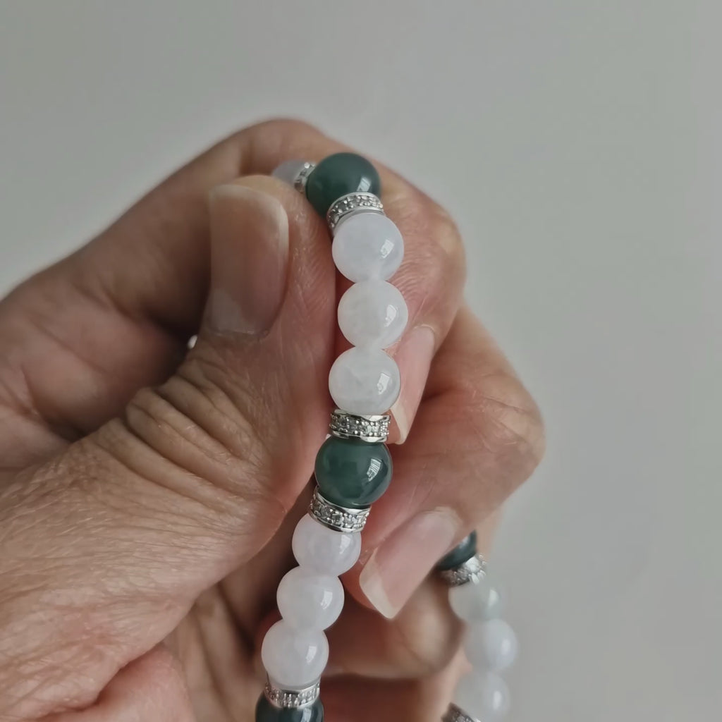 A harmony of contrast and calm, this bracelet features 7mm Type A white jade beads paired with 7.8mm Type A blue jade, creating a balanced interplay of soft translucence and deep, soothing tones. Polished white gold-plated spacers add a subtle shimmer, elevating the design with a touch of modern elegance.